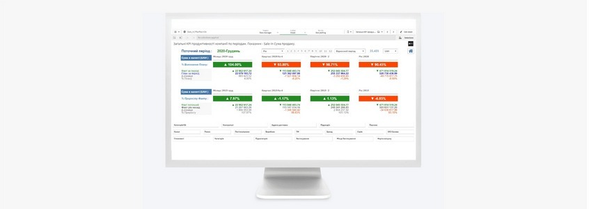 (% Виконання плану, Факт, План, Δ різниця) для поточного Місяця, Квартала, Півріччя, Року та для аналізу Приросту Показника в порівнянні наведених періодів рік назад