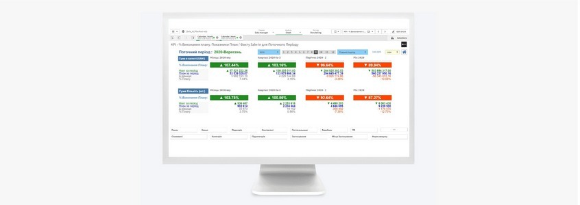 | Загальні KPI. Показник - % Виконання плану. Загальні KPI продуктивності компанії по періодам. Показник - Sale-In % Виконання плану. Форма KPI для аналізу Показника - Sale-In % Виконання плану по Продажам по Сумі та Кількості (% Виконання плану , Факт, План, Δ різниця) для поточного Місяця, Квартала, Півріччя, Року |